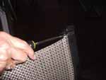 The sling is usually stuck in the side rails. To free it up, first squirt a solution of 1/2 water and 1/2 liquid soap along the entire length of each side rail. Next, carefully push the hem and spline of the sling into the side rail channels with your flat screwdriver. You might hear a slight cracking sound as the fabric breaks free from the metal side rail channels. Be careful not to damage the side rails.