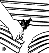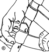 Figure 9: Stretch the strap firmly across the frame at an angle about four or five inches above or below the rivet hole you are going to use for this strap. Stretch until you have pulled about eight to nine inches past the frame. Using heavy thumb pressure of one hand, hold strap in position and begin wrapping the strap completely around the frame with your other hand.